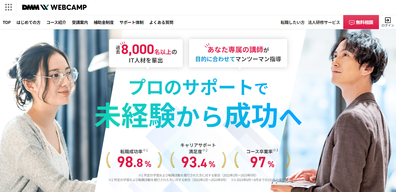 転職成功率が高いプログラミングスクールランキング3位は、「DMM WEB CAMP(DMMウェブキャンプ)」です。