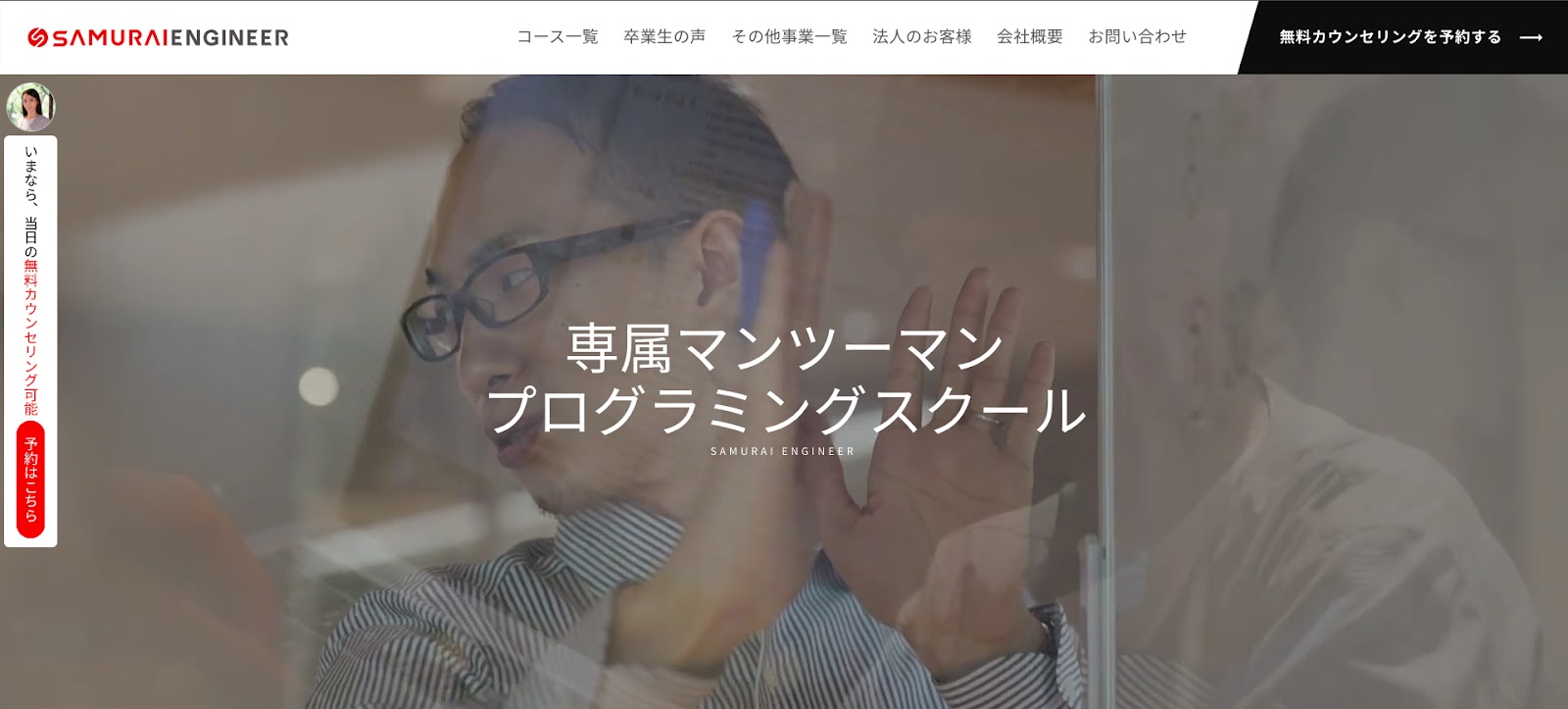 - 転職成功率が高いプログラミングスクールランキング1位は「SAMURAI ENGINEER(侍エンジニア)」。業界に精通したキャリアアドバイザーが受講生ひとりひとりに最適な求人を選定。