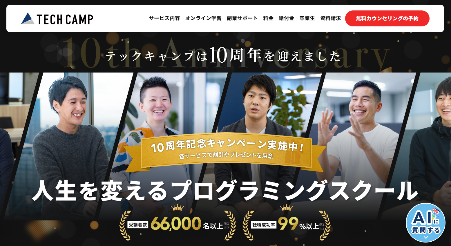 転職成功率が高いプログラミングスクールランキング2位は、「TECHCAMP(テックキャンプ)」です。
