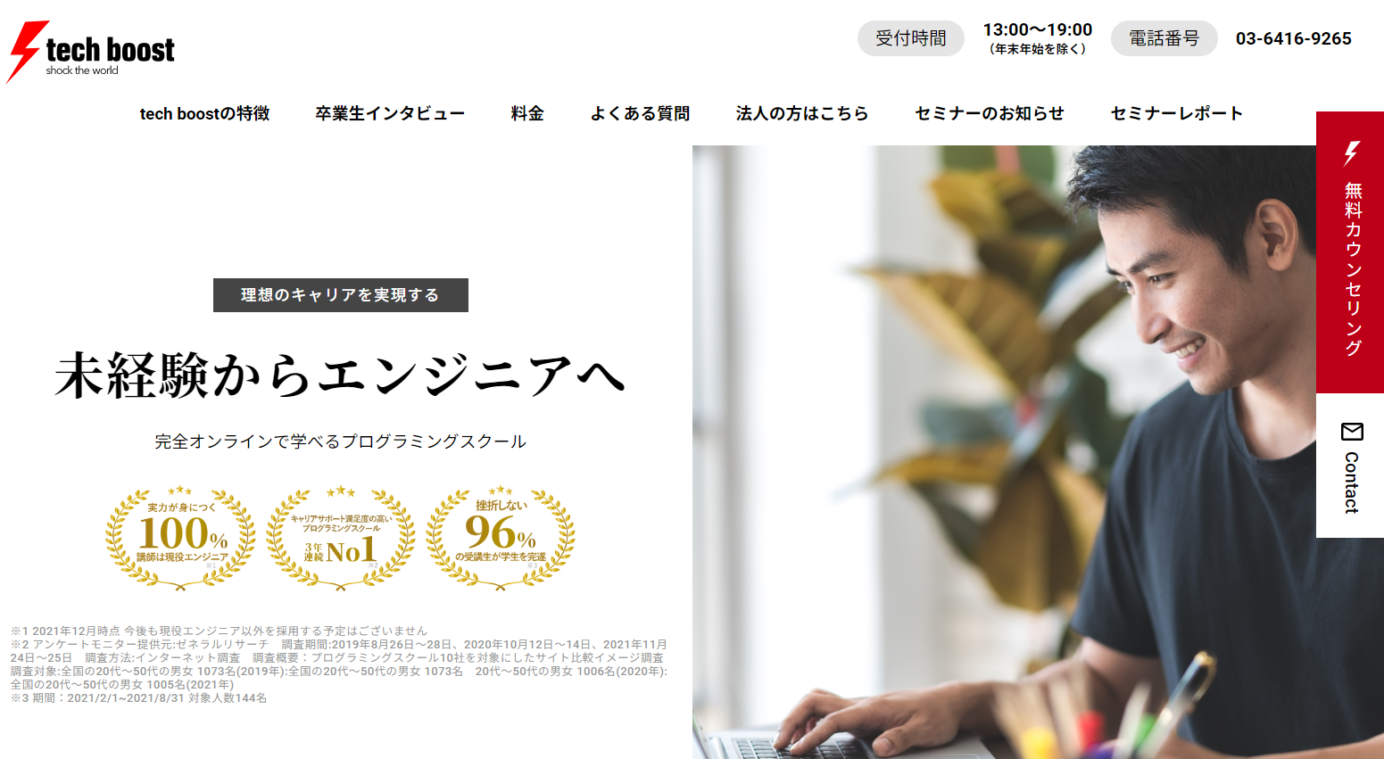 講座の挫折率が低いプログラミングスクール4位は、「tech boost(テックブースト)」です。