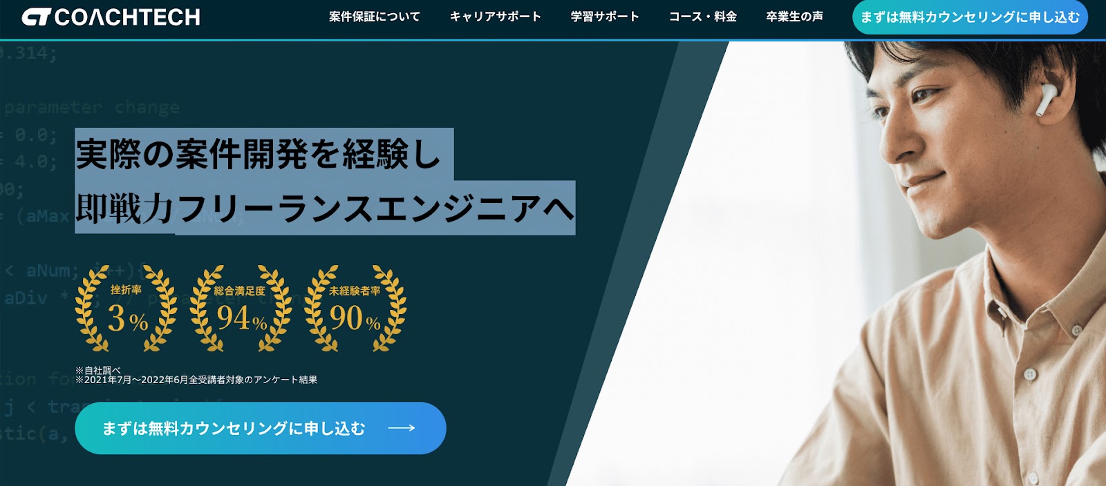 講座の挫折率が低いプログラミングスクールランキング2位は、「COACHTECH(コーチテック)」です。