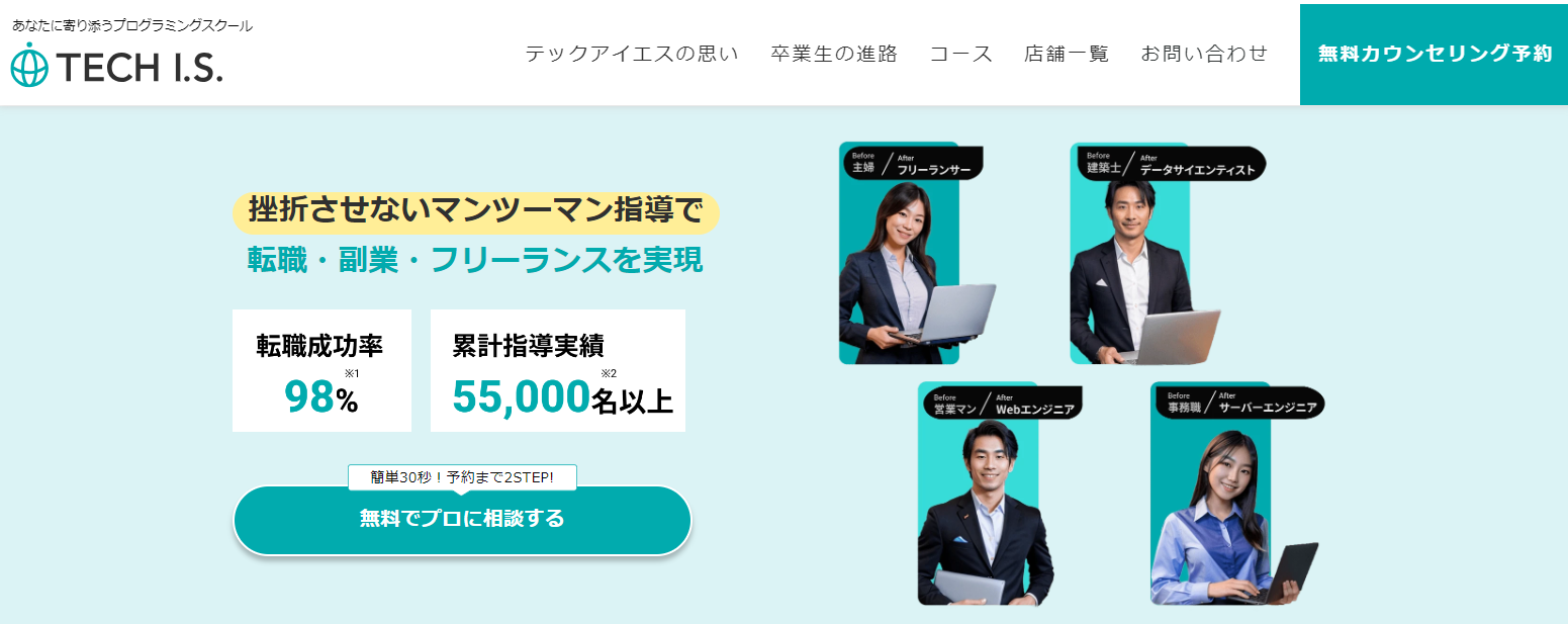 転職成功率が高いプログラミングスクールランキング4位は、「TECH I.S.(テックアイエス)」です。