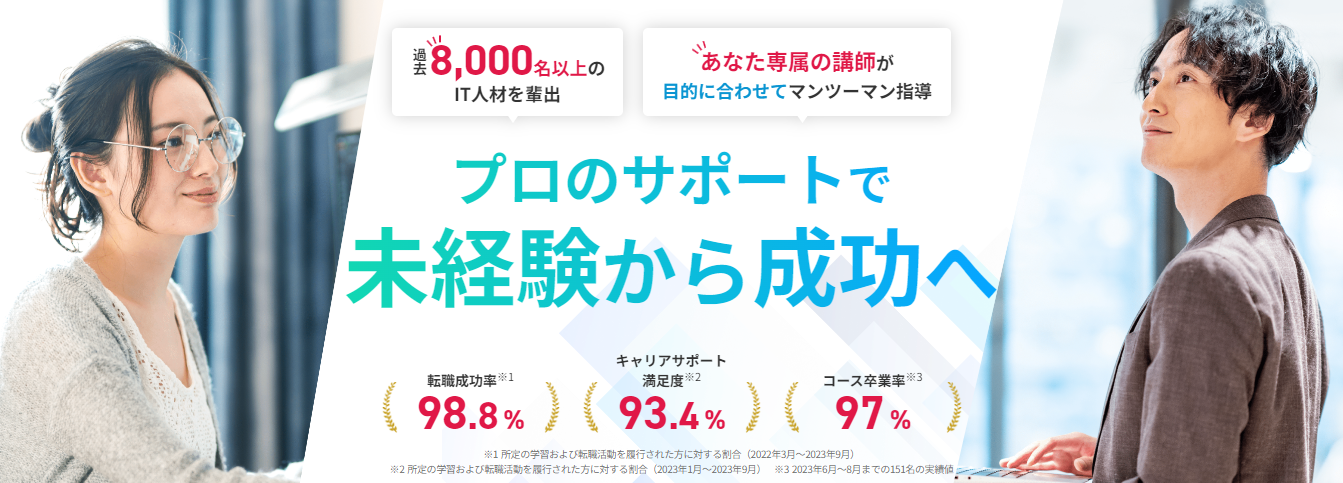 開発現場を意識した実践的なカリキュラムで、挫折を防ぐため、現役エンジニアからの個別指導や無制限の質問対応を含む万全のサポートが受けられるのが特徴です。