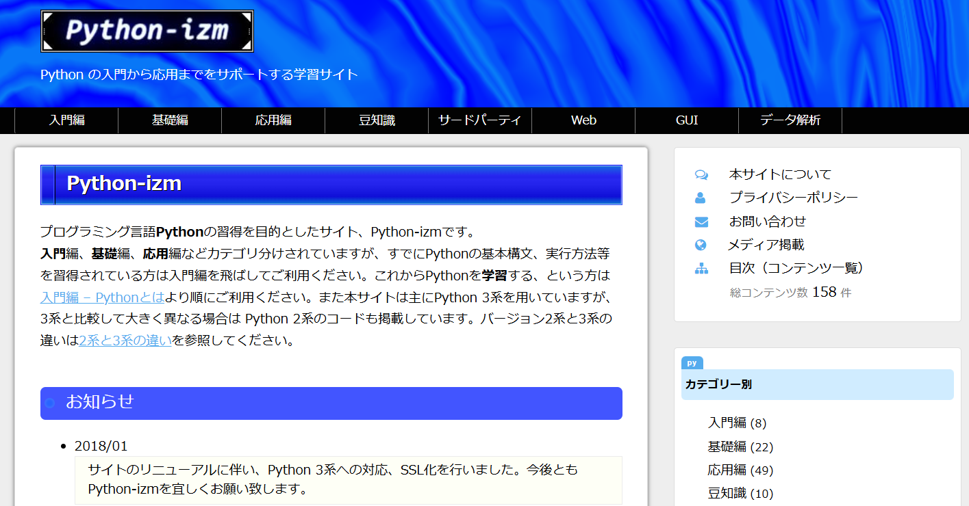 完全無料でありながら内容が充実しており、Python学習の全体像を把握するのに最適なサイトです。