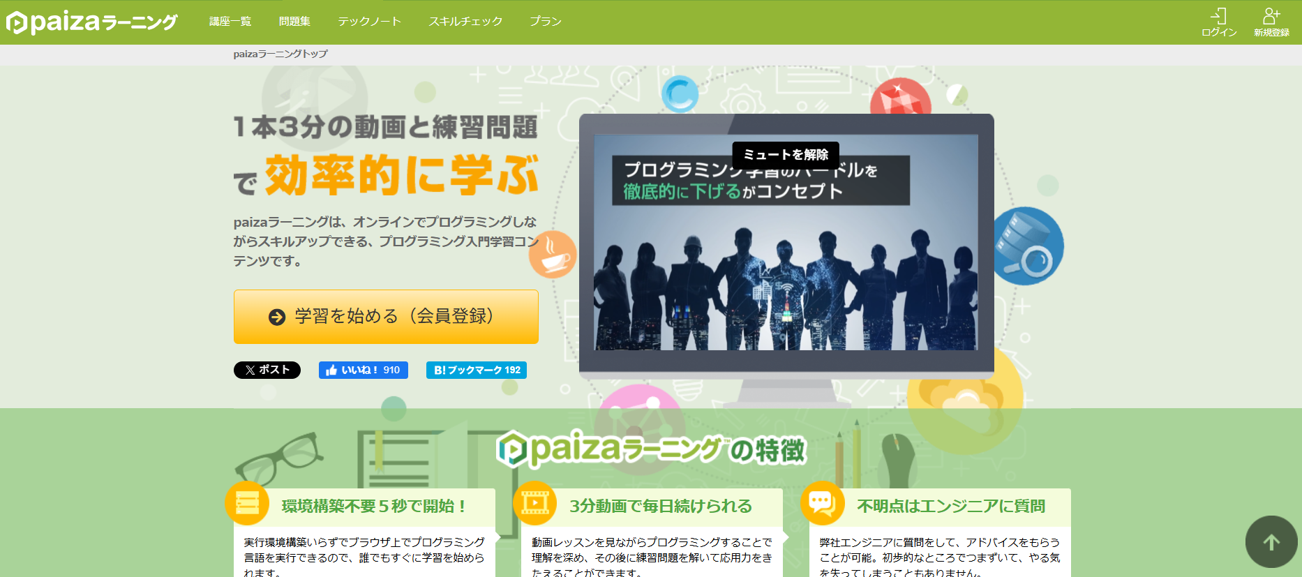 paizaラーニングは、講義動画とブラウザ上での演習を組み合わせた学習サイトです。RPG風のストーリーを楽しみながらプログラミングスキルを身につけられます。