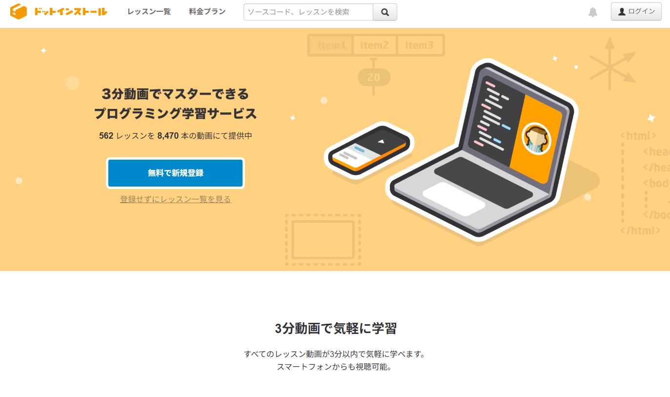 ドットインストールは、1本3分程度の短い動画でプログラミングを学べるサイトです。通勤時間や休憩時間などの隙間時間を活用して学習を進められます。