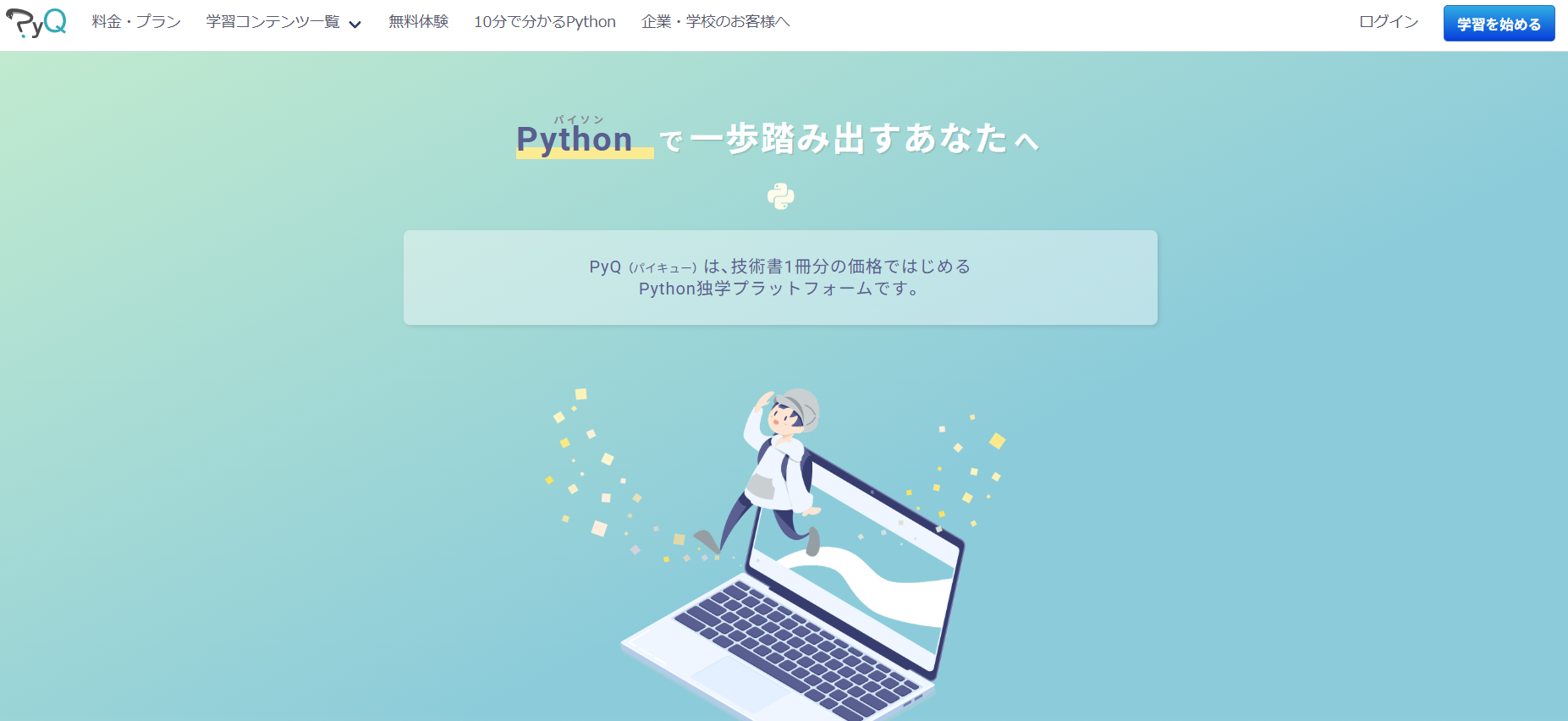 PyQは、Pythonに特化した独学用プラットフォームです。環境構築不要で、ブラウザ上で実行しながら文法やアプリ開発、データ分析を学習できます。