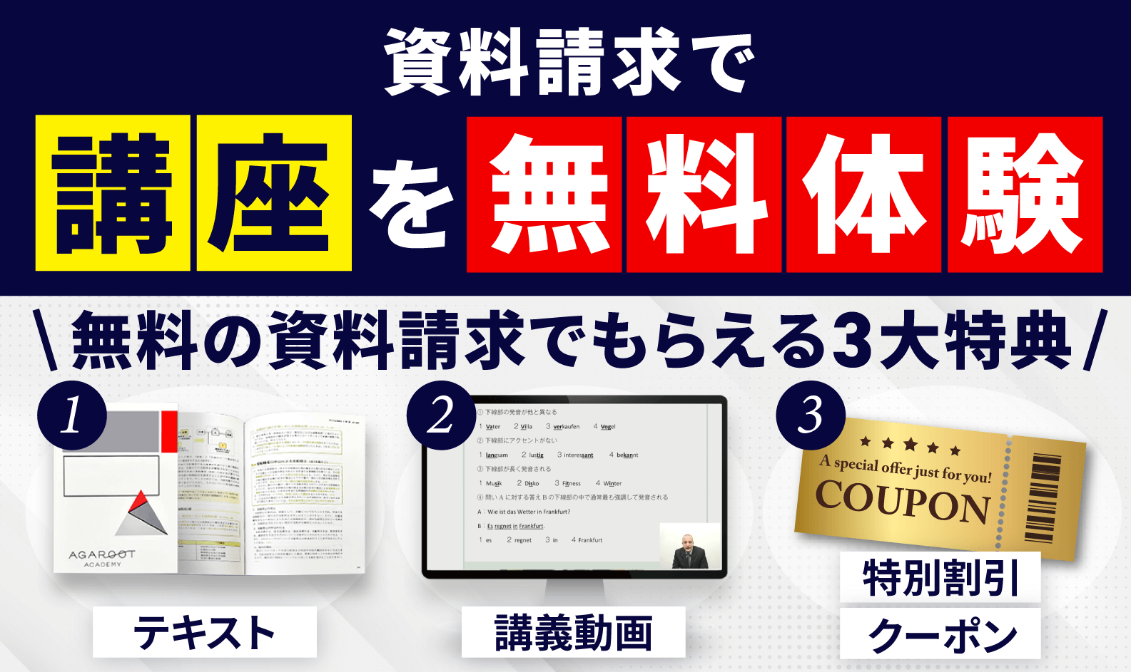 今なら資料請求された方限定で、「ドイツ語技能検定試験講座」の講義動画とテキストサンプルが「AGAROOT Learning」アプリで視聴可能です。