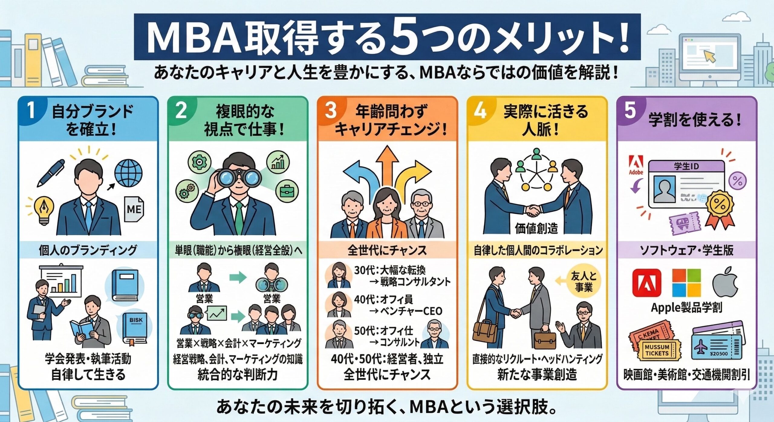 MBAを取得するメリットやMBAを取る意味があるのかについて、5つの観点から解説します。