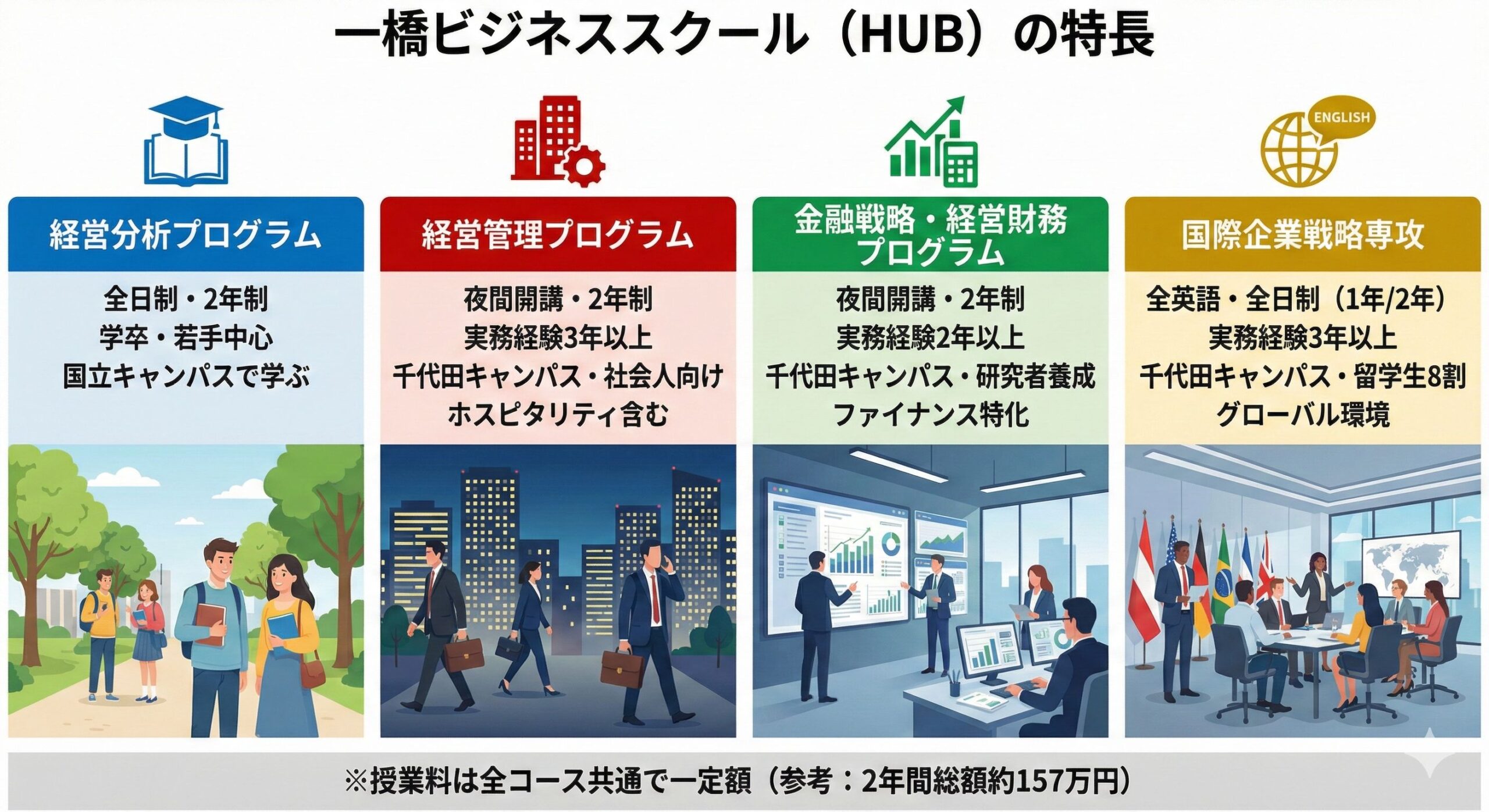 一橋大学大学院経営管理研究科(一橋ビジネススクール、一橋MBA)は4つのコースがあります。