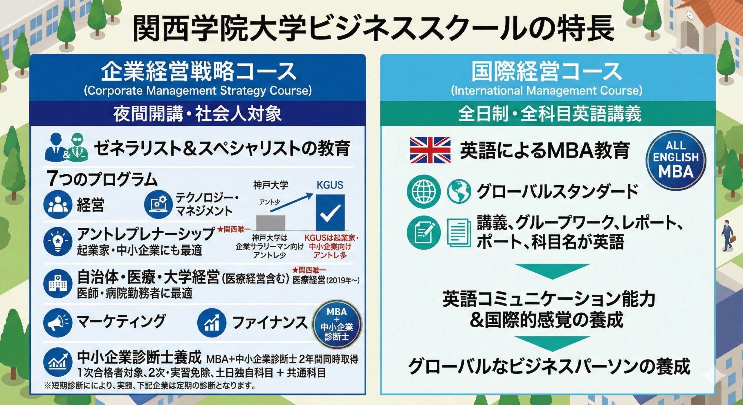 関西学院大学大学院 経営戦略研究科は、「社会人のみを対象とした夜間開講の企業経営戦略コース」と「大学新卒者、外国人留学生、社会人を対象とした全日制のMBA教育プログラムで、グローバルスタンダードに基づいて全科目を英語で講義する「国際経営コース」の2つがあります。