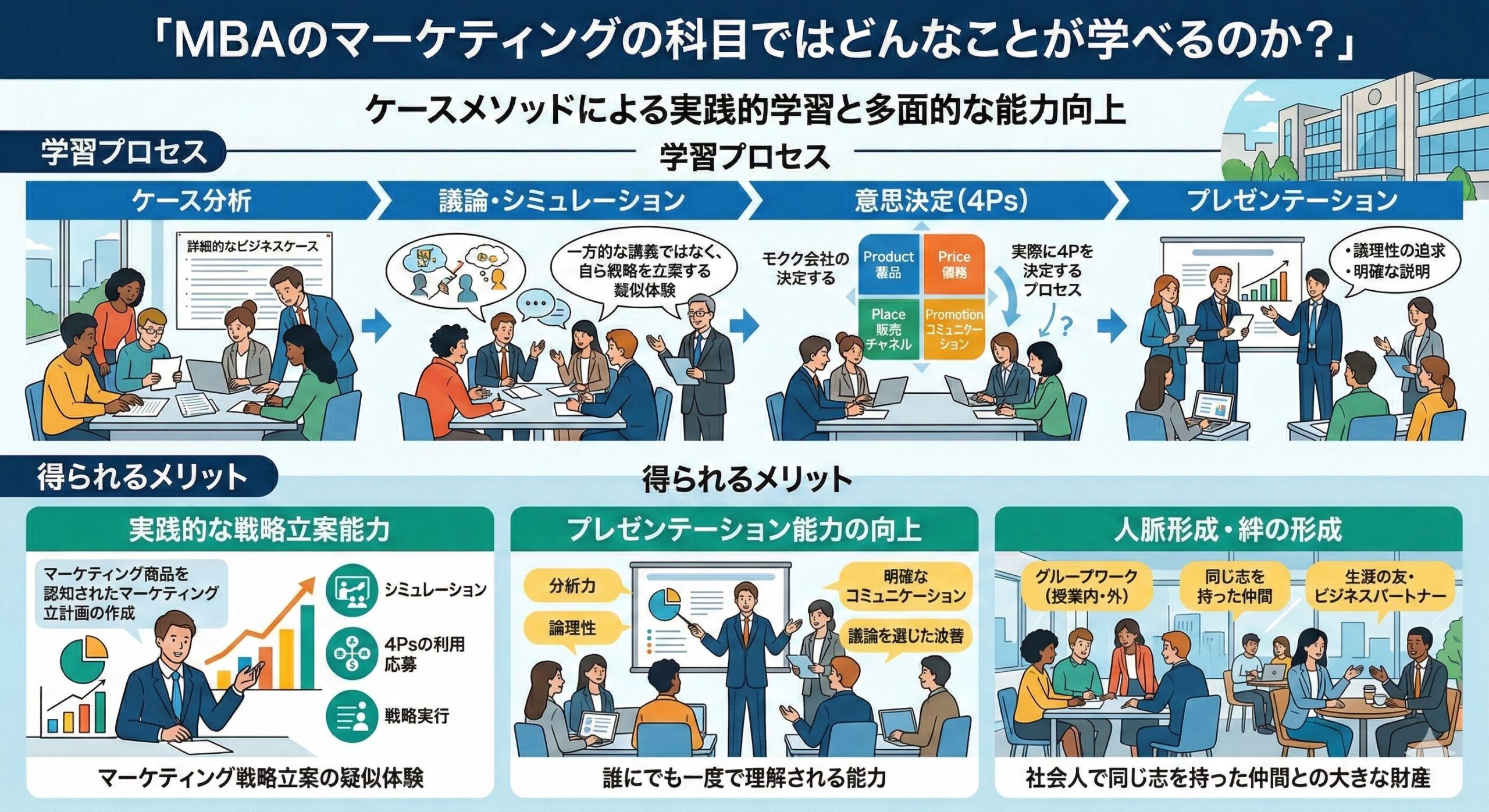 MBAではケースメソッドと言って実戦形式でマーケティング戦略立案の疑似体験を通じてマーケティングについて学ぶことができます。