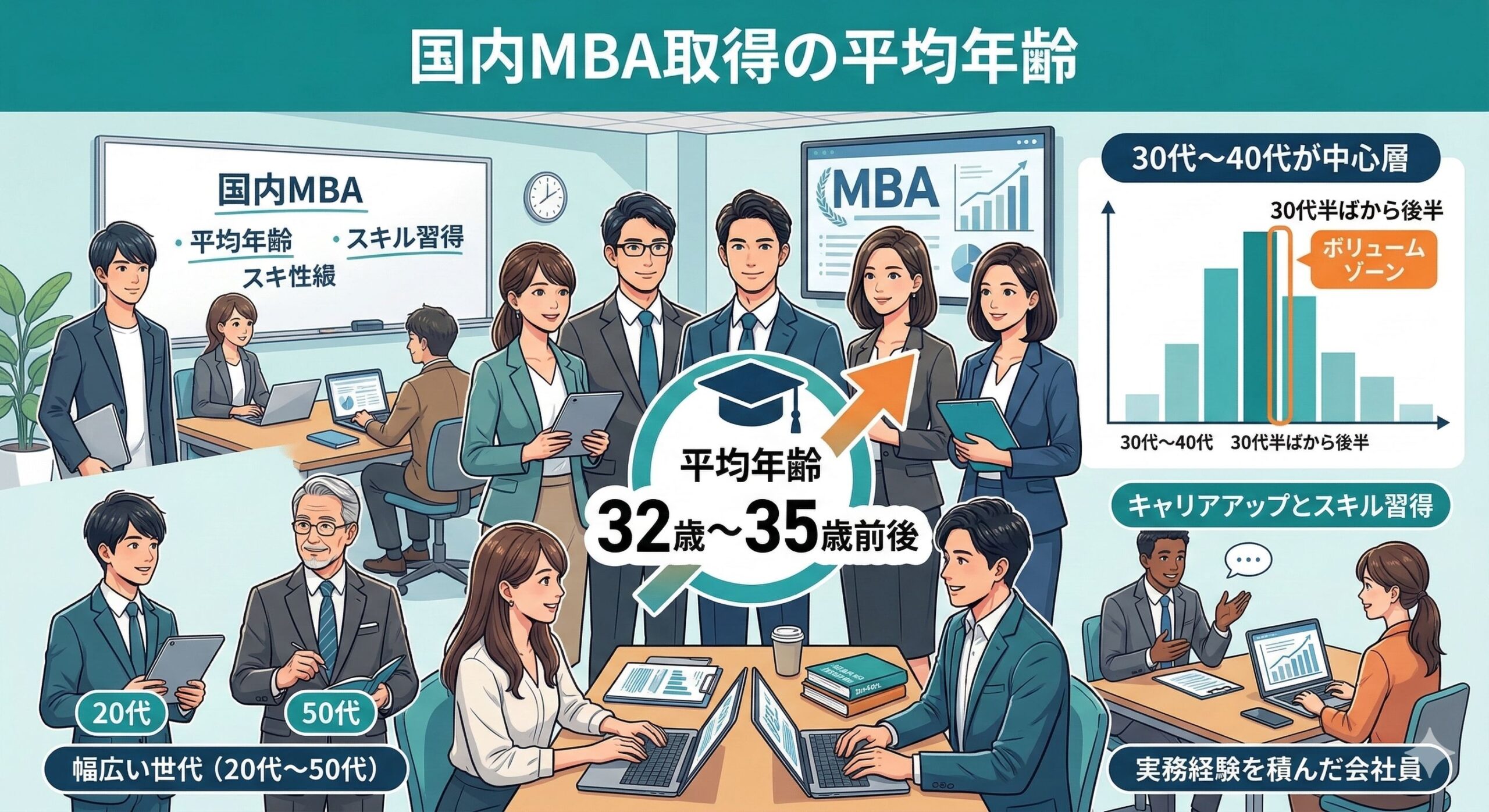 国内MBA取得者の平均年齢は概ね32歳〜35歳前後であり、30代〜40代が中心層です。実務経験を積んだ会社員がキャリアアップやスキル習得を目的に通うケースが多く、20代から50代まで幅広い世代が在籍していますが、特に30代半ばから後半がボリュームゾーンとなっています。
