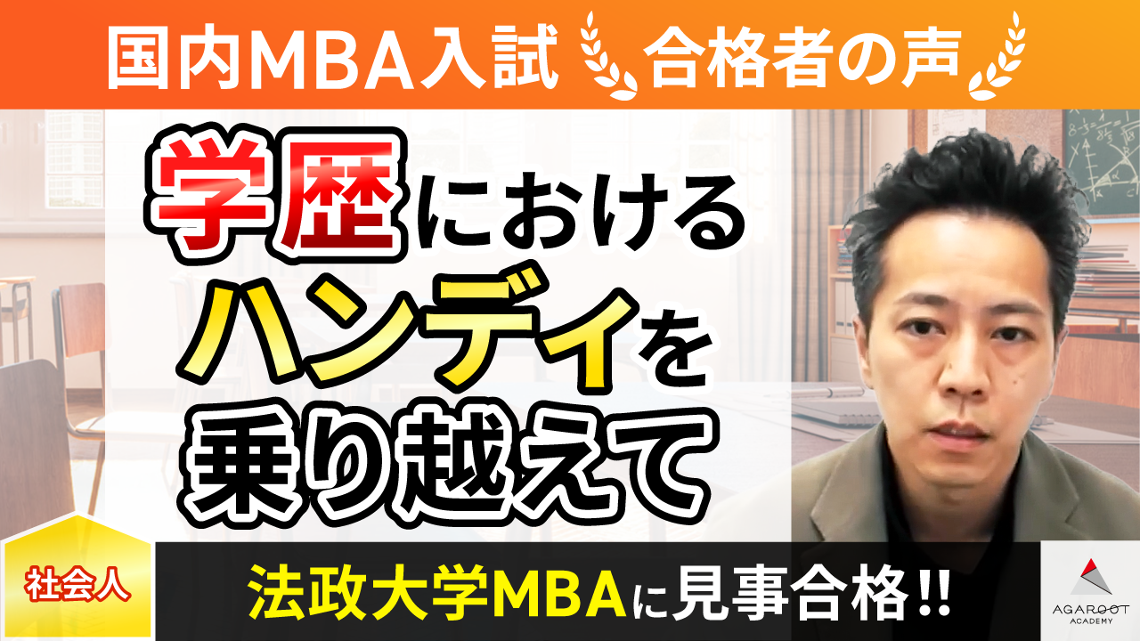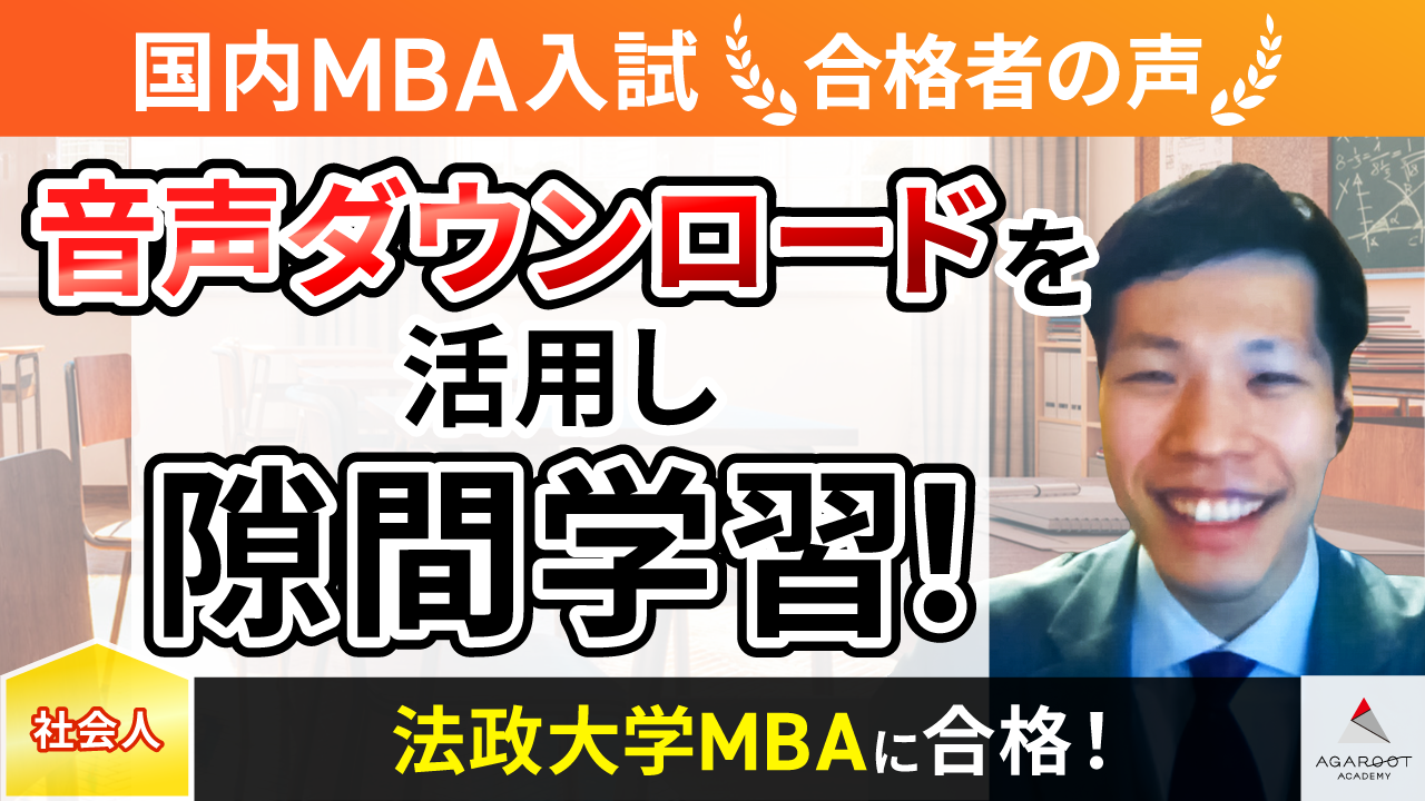 ゼロからのスタートでも、国内MBA受験に必要なる知識から対策までを完全に網羅されていると思います。アガルートの講座を通じて国内MBA受験に必要な経営学に関する基礎的な知識や論理的な思考を研鑽することができました。