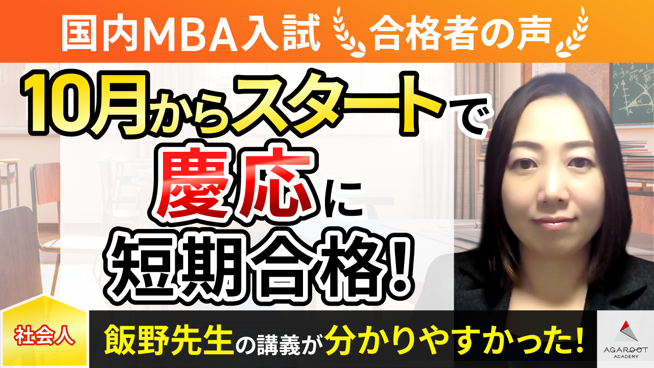 合格実績、講義・テキストのクオリティ、合格特典の3点でアガルートの受講を決めました。私は9月にMBAを検討し始めたので、通常の受験者より準備期間がかなり短く、短期間で効果がある講座を受ける必要がありました。