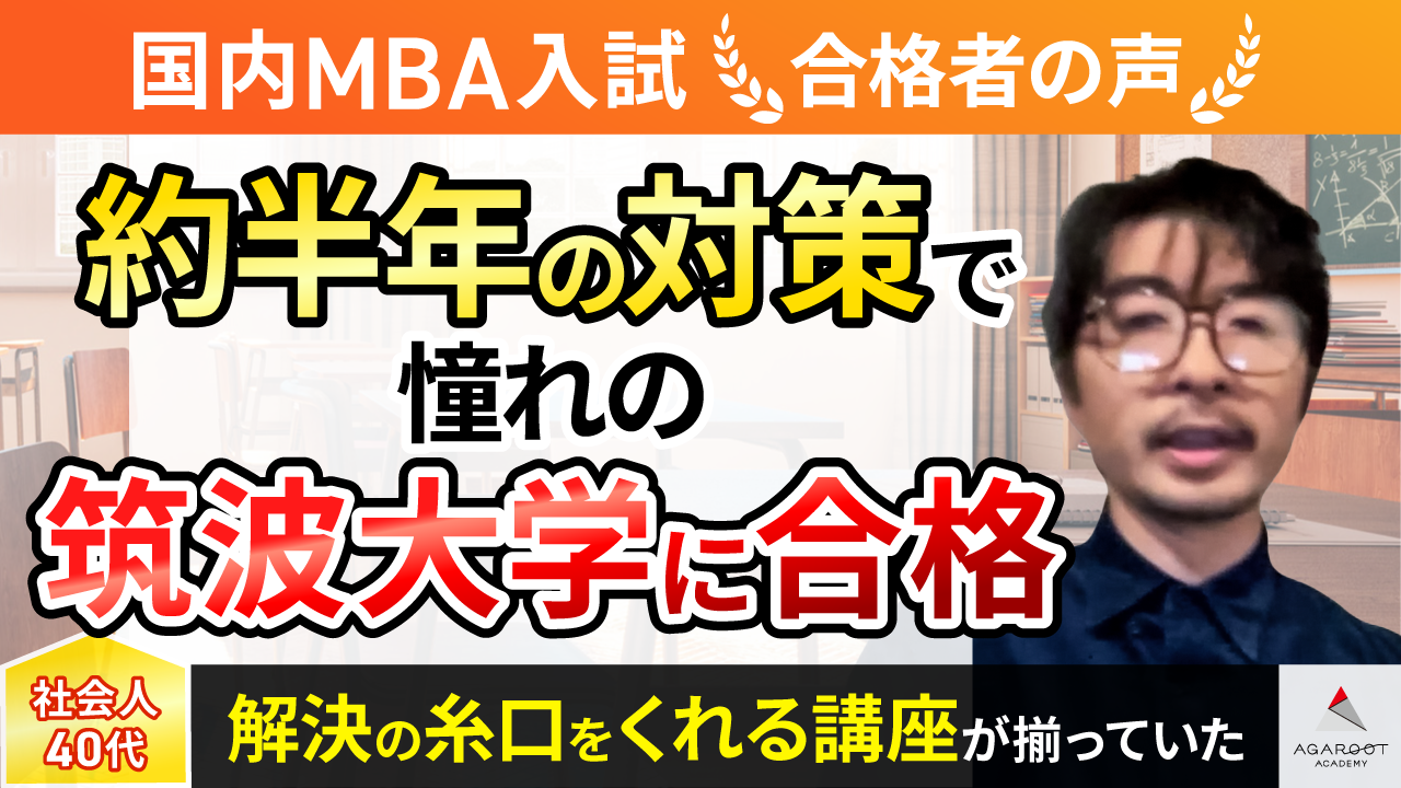今までのビジネス実績だけで合格できるほど甘くはないと考えていたので私はアガルートを受講しました。特に小論文の過去問が数年分入手できたことと、様々な合格者の研究計画書を読めたことが合格に繋がりました。また独学では難しい添削も有難かったです。