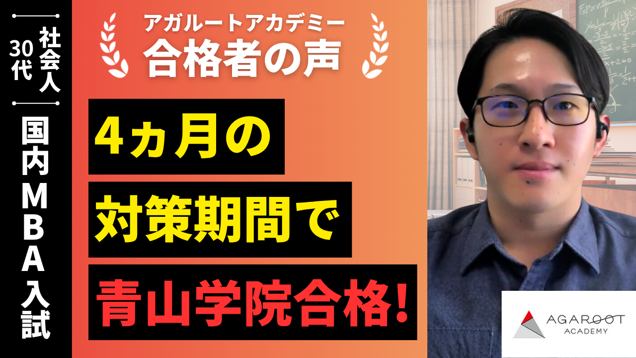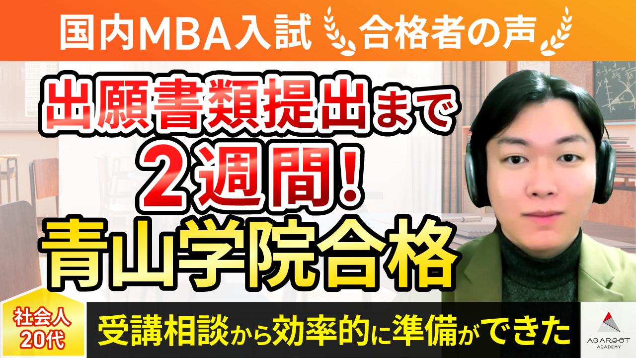 アガルートアカデミーを選んだ理由は実績面が一番の安心要素でした。他の予備校と比較しましたが、しっかり経営学の基礎講座等も準備されており、また提出書類の添削が無制限であることも魅力に感じました。実際に受けてみて感じた魅力ですが、志望校の選定に大きく影響がありました。当初なんとなく早稲田を受けようと考えていましたが、各校のメリットデメリットを聞き、自分に最も最適な学校を選ぶことができました。早稲田というブランドに惹かれていましたが、自信をもって青学がいいと決心でき、効率の良い受験対策ができたと感じています。