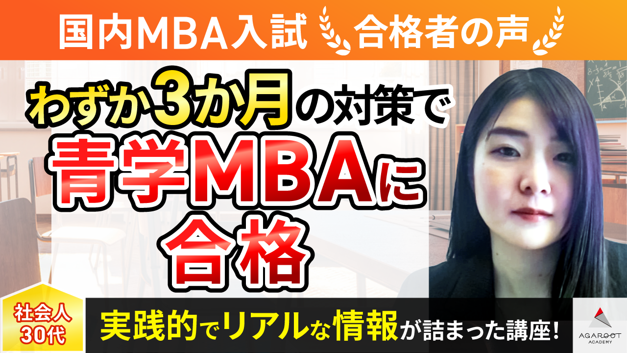 MBAを目指したきっかけは、周りにMBAホルダーが多かったことです。もともとMBAには興味がありましたが、MBAホルダーのかたの働きぶりをみて、憧れを持ちました。MBAに関して調べたときにアガルートのYouTube動画と出会い、MBAを取得するメリットの説明を聞き、まさに自分のこれからに必要なものだと感じました。アガルートの動画と出会わなければ、MBAはなにかすごいものというざっくりしたイメージで具体的に行動に移すことはなかったと思います。