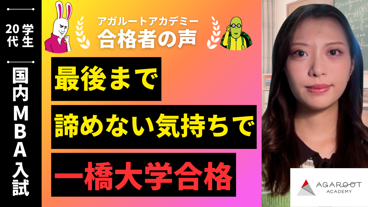 MBAを目指すという理由はさまざまだと思います。時間と金を犠牲にして目指していくにはそれなりのエネルギーが必要です。本当に自分に必要なキャリアなのか、家庭の都合はつくのか、本業との都合はつくのか、まずそこを踏み出すことが自分は調整に時間がかかりました。決めたら、自分の理念、野心、周囲から協力・応援していただいていることへの感謝の気持ちをエネルギーにして突き進んでください。アガルートの考えつくされたカリキュラムは信頼できますので、頑張ってください。