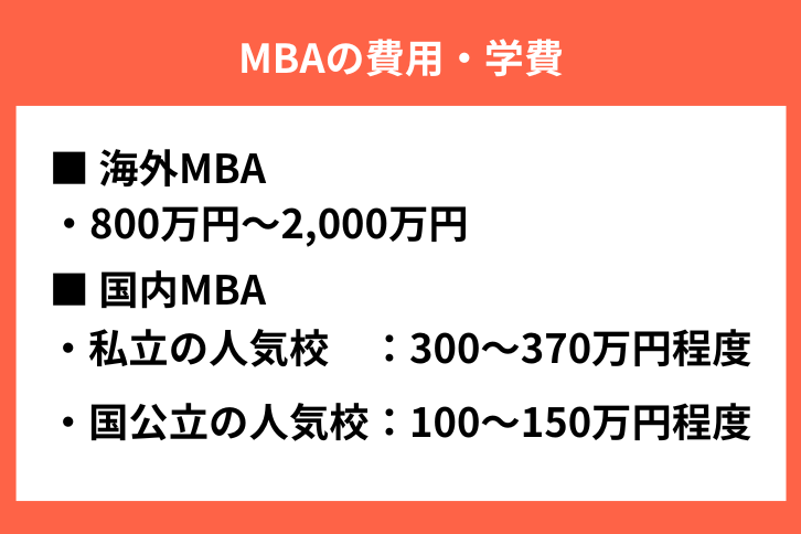 相場としては、海外MBAが800万円~2,000万円、国内MBAが100万円~430万円となっており、海外の方が高い傾向があります。