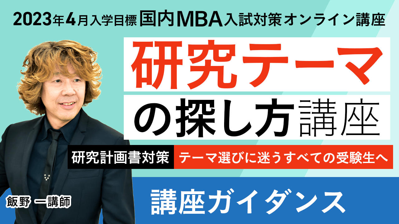 本講座は、国内MBA入試における研究計画書を作成するにあたり、自分が興味のある研究テーマを設定するためのヒントと最新の研究の動向に関する見識を得て、ご自身のテーマを有意義なものとすることを目的とした講座です。