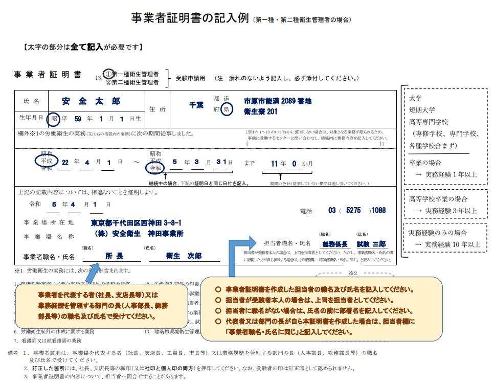 衛生管理者試験の受験を申し込む際、受験申請書(願書)に「事業者証明書」を添付するよう求められるケースがあります。