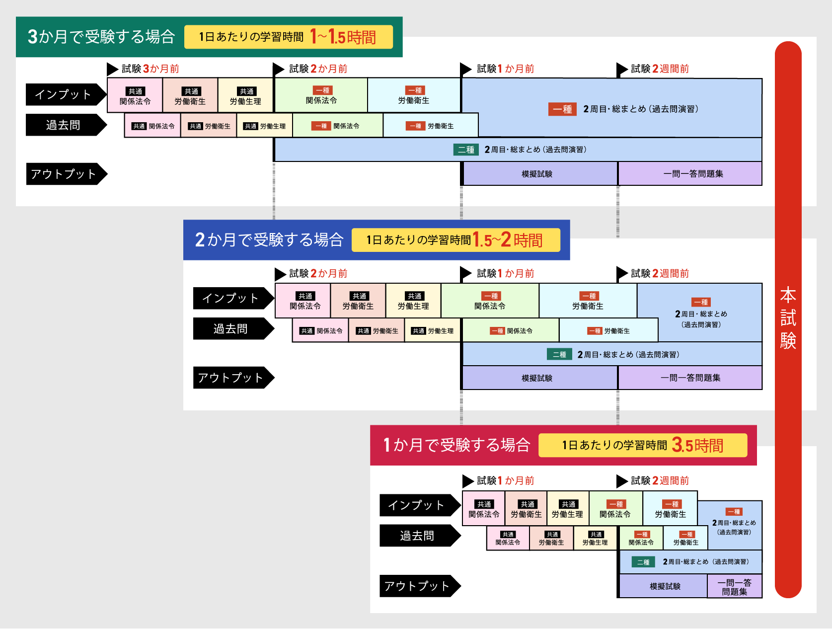 | 試験3か月前 | インプット学習(基礎固め) まずは試験の共通科目である「関係法令」「労働衛生」「労働生理」の3分野について、テキストなどを通して基本的な知識をインプットします。 |