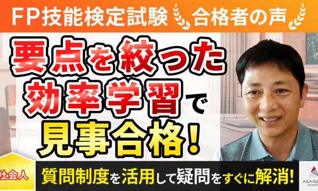 アガルートで別講義(マン管・管理業務主任者)と並行してFPの勉強を行っていましたが、短期間でかつ初学で一回目で合格出来たのでとても満足しています。