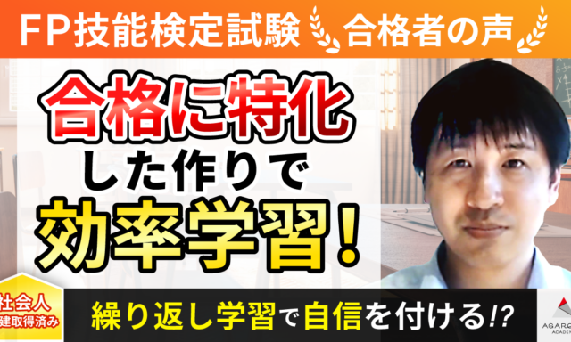 実は大学在学時に2級試験を受験したのですが、その時は実技試験に落ちてしまいました。当時は独学で対策をしており、問題演習など実践が不足していたのだと思います。社会人になって改めて、リベンジ受験を志しました。次こそは必ず合格を意識し、資格講座を検討していたところ、テキストと映像授業のインプットに加え、豊富に演習問題が用意されている点に魅力を感じ、アガルートアカデミーの講座の受講を決めました。