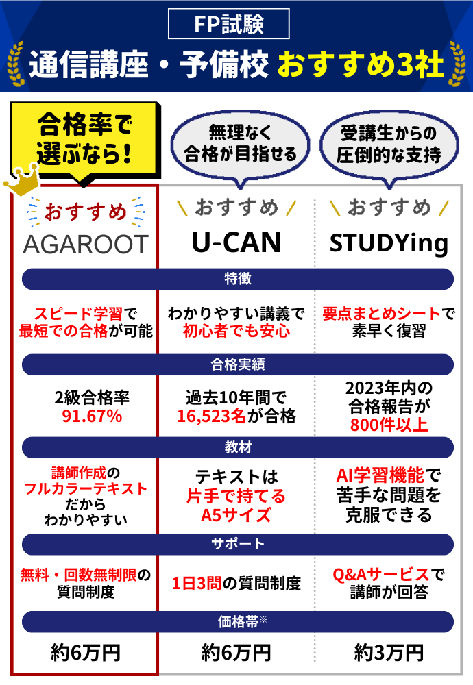 以下の目的別にFP試験対策におすすめの通信講座・予備校を紹介します。