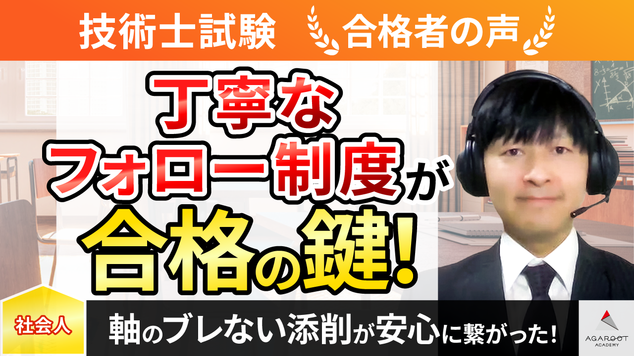 アガルートで、日比先生の講座で、良かったと思っています。ありがとうございました。受験にあたり、サポートされているという安心感、これが重要と思いました。