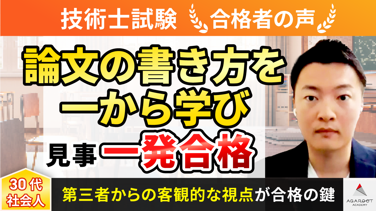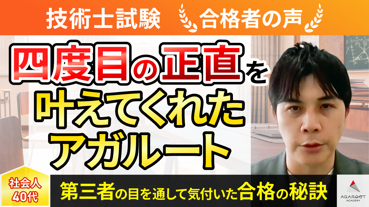 令和6年度は、課題抽出、解決策において客観的な評価が必要と判断し、昨年度の合格者からアガルートアカデミーのことを知り受講しました。また、技術資格の講座は、沢山あり選択に迷います。しかし、スマホを活用したテキスト、添削回数5回、口頭試験対策もついて、価格帯としては申し分ないと判断し決めました。