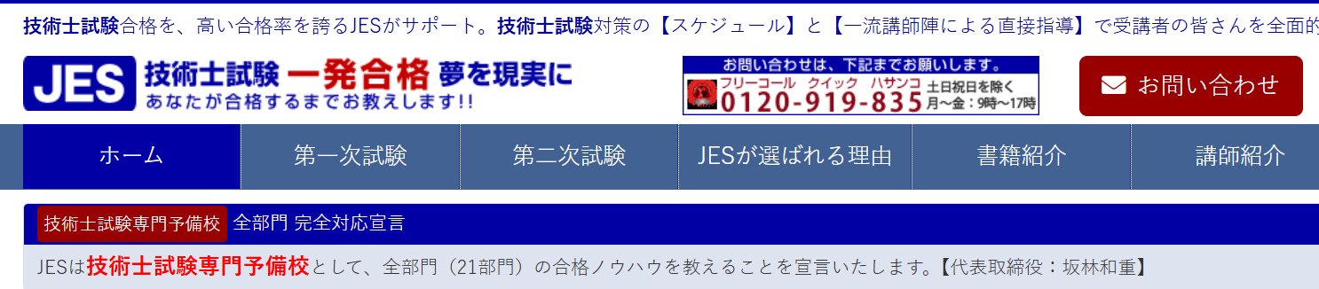 | JES | トータルコース:232,960円 スタンダードコース:178,100円 | 一次試験:2,980/月 | 高い合格率 | 講演資料と動画・講師よるテキスト | メールでの添削回数無制限/個別面談対応/欠席時フォロー |
