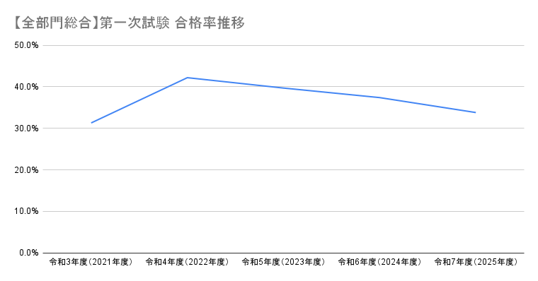 第一次試験全部門の合格率は33.8%ですが、部門によって合格率が大きく違います。