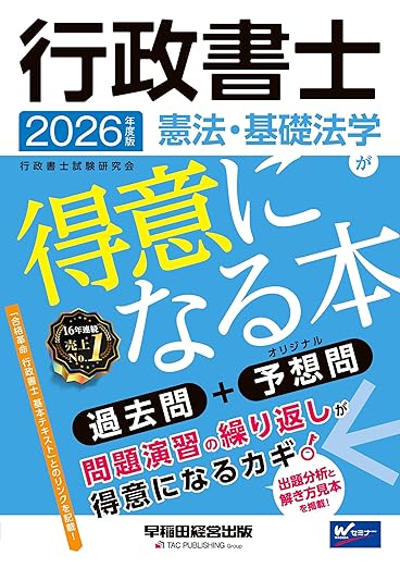 行政書士 憲法・基礎法学が得意になる本(早稲田経営出版)は、憲法・基礎法学の本試験問題とオリジナル予想問題がバランスよく掲載された問題集です。