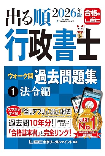 『出る順 行政書士 ウォーク問顔問題集1 法令編(東京リーガルマインド)』は、2016年〜2025年までの10年分の本試験問題が収録された過去問題集です。