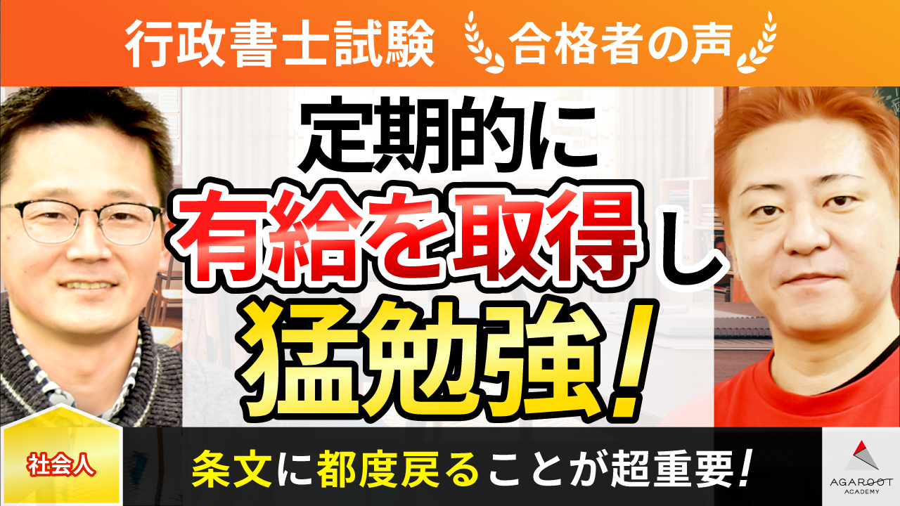 5年が経ち、再び受験を決意。今度は必ず受かるよう、学習量が多くても試験範囲を網羅したスクールを探して各校の講義をお試し視聴した。スーツを着て抑揚のない話し方をする講師が多く、観ていて眠くなってしまう中で、奇抜な髪と服装で話が面白い豊村講師を見つけた。テキストのカバー率の高さ、圧倒的な講義動画時間の多さ、合格率の高さ、合格したら全額返金の制度も含めてここしかないと思い、アガルートに決めた。