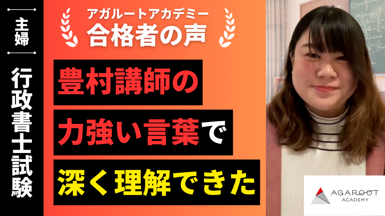 まず第一に、他の通信教育に比べて合格実績が抜群に良いなと思いました。また、お試しで無料の講座を拝見した際、豊村先生の力強い言葉と指導方法が、私をやる気にさせてくれそうだなと感じアガルートを選択しました。