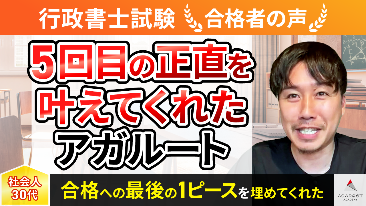 土地家屋調査士を受験する時に答練の受講をさせていただいたのですが、その際に使用した教材の質が高く、大いに力をつけさせていただき、試験に合格しました。その時にアガルートは信頼できる予備校だなと思いましたので、今回の行政書士試験の際も受講させていただきました。