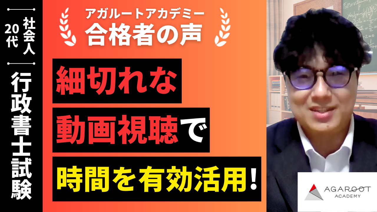 仕事が忙しくなり独学では難しいと感じ、講座受講を検討しました。様々なところから資料請求し、動画視聴をしてみたところ、アガルート様の動画が分かりやすいと思い、受講に至りました。豊村先生のインパクトある講義やYouTubeの動画が決め手になりました。