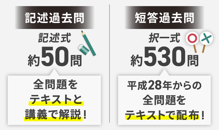 記述過去問は全問題を講義で解説し、短答過去問に関してはテキストのみを配布し、現実的に消化可能でありながら、合格に必要な知識のみを厳選しています。また講師オリジナルの模擬試験で実践力までしっかり身につけることが可能です。
