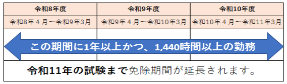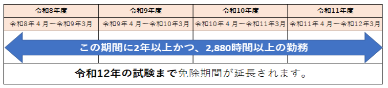 また、令和8年4月~令和12年3月までの間に、2年以上かつ2,880時間以上の勤務経験があることで、令和12年の試験まで免除期間が延長されます。
