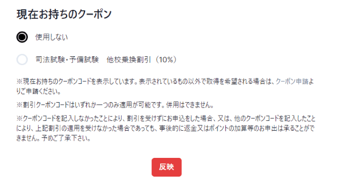- お申込み後、遡ってのクーポン適用はできかねます。必ず、お申込み前にご申請ください。