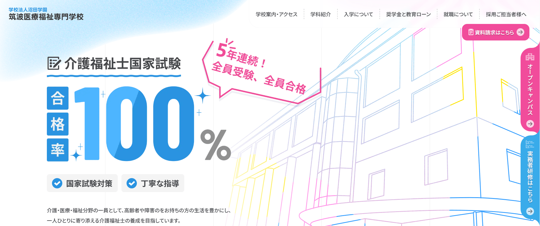 特に実習の充実度が高く、介護施設や病院での現場経験を多く積める点が強みです。