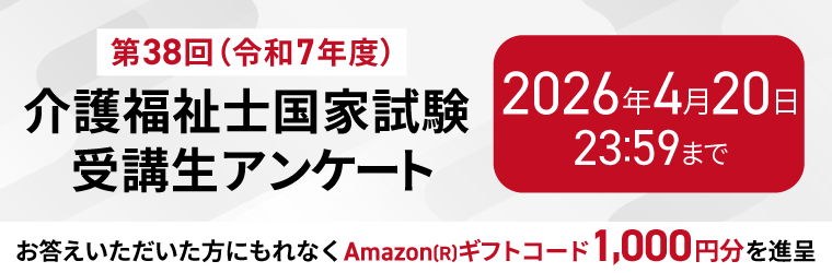 介護福祉士国家試験の有料講座を受講され(※2025年合格目標以前で受講年問わず)、令和7年度本試験に受験申込をされた方を対象として、合否確認を含む簡単なアンケートを実施しております。お答えいただいた方にはもれなくAmazon(R)ギフトコード1,000円分を進呈いたします。