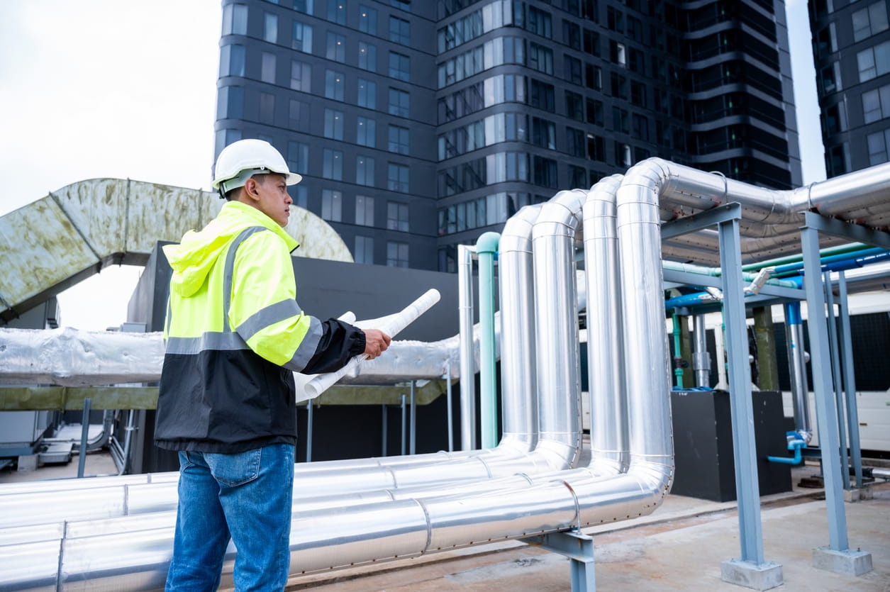 オフィスビルやマンション、商業施設、工場などあらゆる建築物には空調や給排水といった設備が不可欠であり、施工現場で技術的な管理を担うのが管工事施工管理技士の役割です。