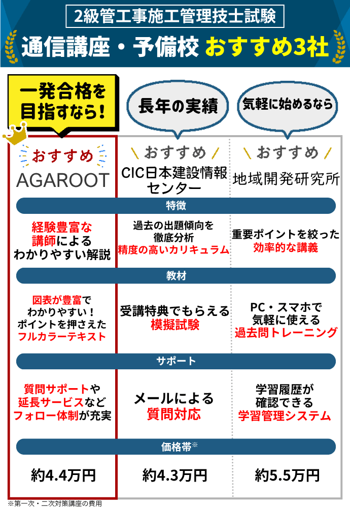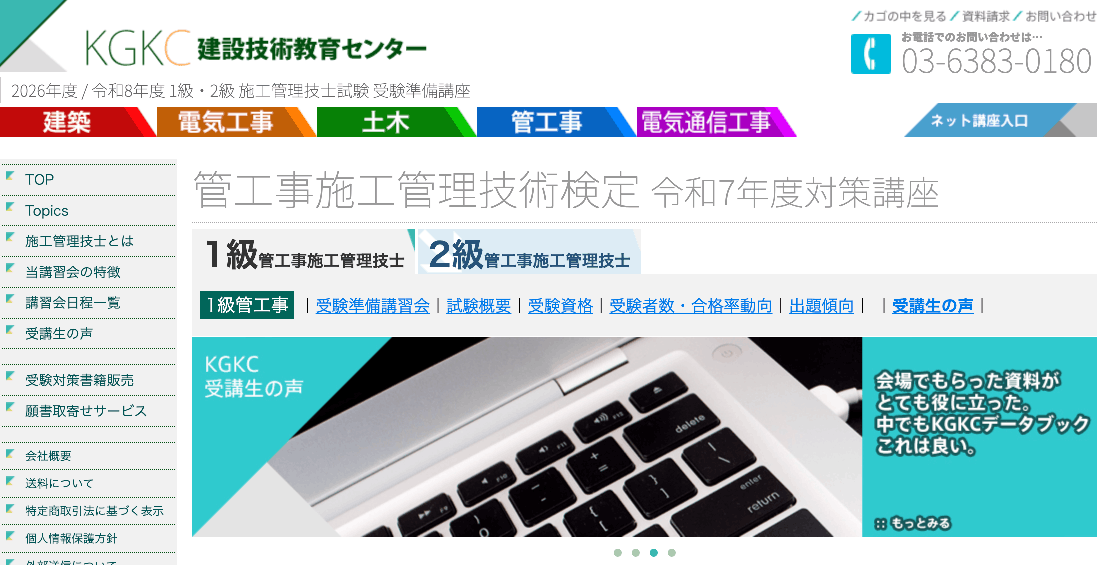 | 建設技術教育センター | ・施工管理技士専門の受験準備講習会機関 ・重要ポイントを絞り込んだ効率的なカリキュラム ・ベテラン講師陣による丁寧な解説 |