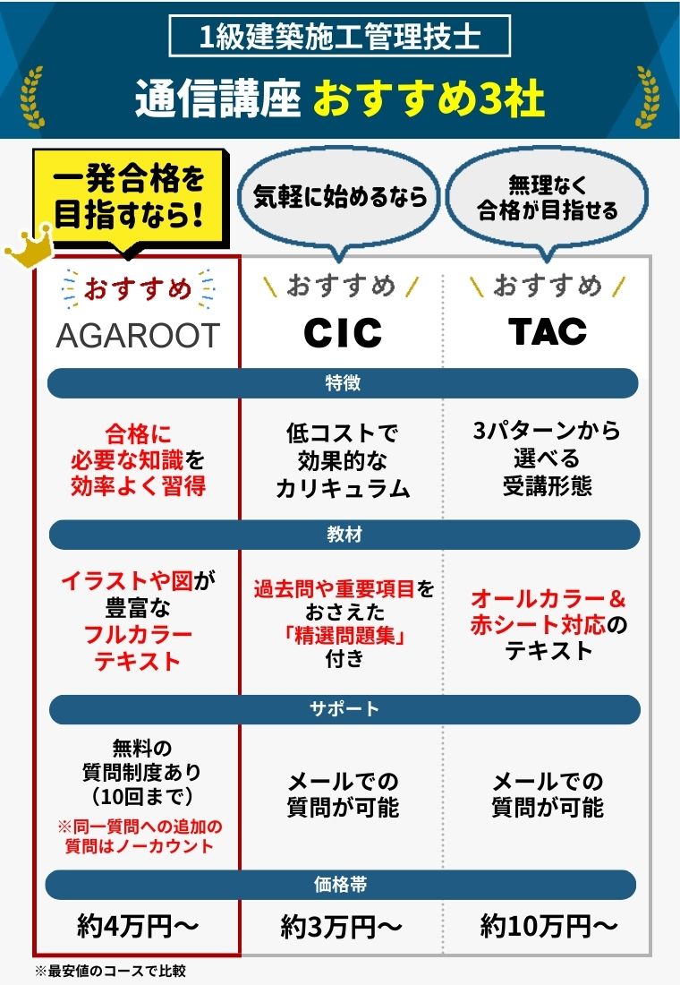 費用・サポート体制などを考慮した上で、特におすすめの1級建築施工管理技士試験の通信講座・予備校3社はこちらです。