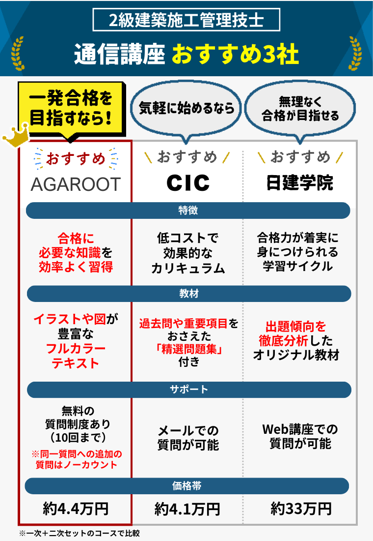 | CIC日本建設情報センター | 建築施工管理技士2級(一次・二次)WEB講座 | 42,900円 | ・WEB・DVD・通学の3つのタイプから選べる ・新試験制度に合わせて改定したわかりやすい教材 |