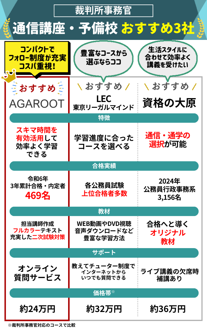 裁判所事務官試験の合否は対策方法に大きく左右されるといっても過言ではないため、後悔のない対策方法選びに繋げてください。